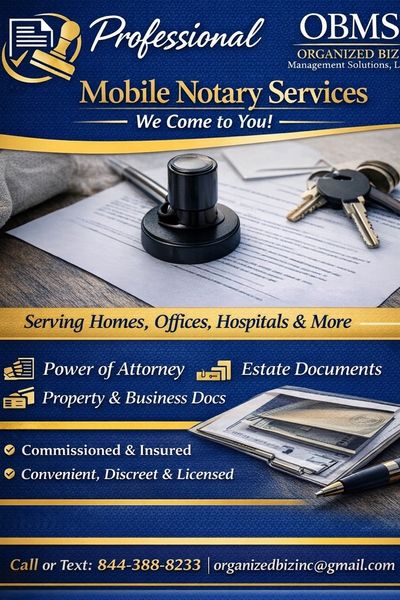 Organized Biz Management Solutions, LLC now offers professional Mobile Notary Services throughout the area. As a commissioned Notary Public, OBMS provides convenient, on-site notarization for individuals, families, business owners, property owners, and professionals who require accurate and efficient document authentication. We travel to your location — home, office, hospital, assisted living facility, or agreed meeting space — ensuring your documents are properly notarized in compliance with state law.